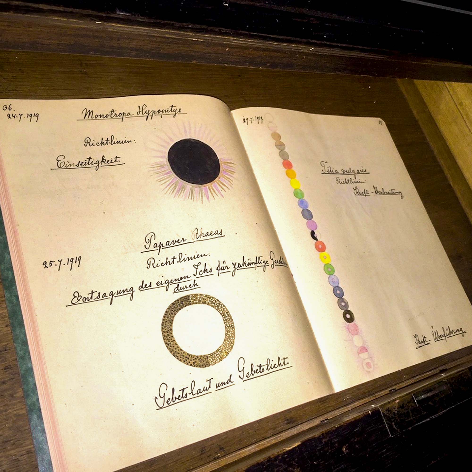 Hilma af Klint hatte die Absicht, ihre Arbeiten im Goetheanum zu zeigen. Ihr Brief an Rudolf Steiner (1862–1925) von 1924 blieb jedoch ohne Antwort. Auch Albert Steffen (1884–1965), der erste Vorstand der Anthroposophischen Gesellschaft nach Steiners Tod, antwortete ihr nicht. (2) Das Notizbuch und die Bilder, die Hilma af Klint ihm zur Ansicht übergab, verschwanden im Archiv. So wurden erst kürzlich die von ihr angefertigte Originalkopie des Notizbuches ‹Blumen, Moose, Flechten› und die Bilderserie ‹Baum der Erkenntnis› in Dornach entdeckt.