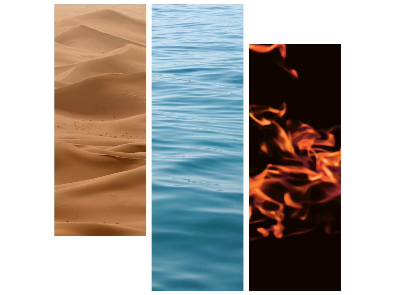 Fotos Wüste: Wolfgang Hasselmann, Meer: Joshua Humpfer, Feuer: Jan Huber, alle unsplash.