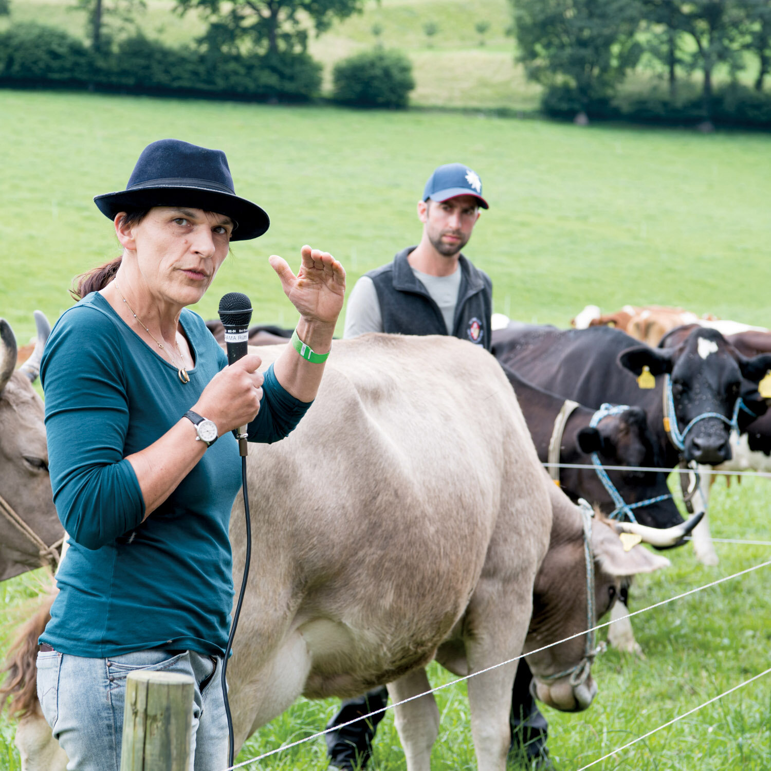 Bild: Anet Spengler Neff stellt die standortgerechte Kuhhaltung zusammen mit Landwirten beim Bioviehtag 2018 vor. Foto: Marion Nitsch.