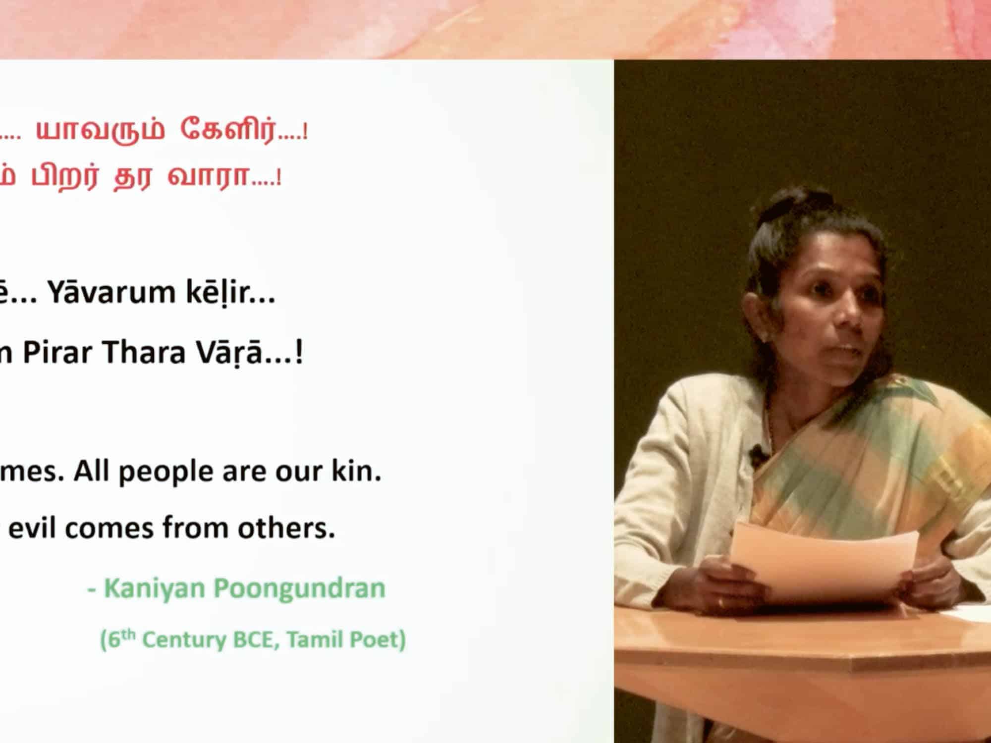 In drei Einzelvorträgen und einem anschließenden Gespräch zeigen Anthoniselvi Savarimuthu aus Indien, Diego Porras aus Kolumbien/Mexiko und Maria Widiyanto von der indonesischen Insel Bali, welch wichtige Bedeutung die Lebensweise und das Wissen indigener Kulturen für eine zukunftsfähige Landwirtschaft haben. Savarimuthu beginnt ihren Vortrag mit der Feststellung, dass moderne Technologien zwar viele Herausforderungen in der Landwirtschaft lösen konnten, jedoch gleichzeitig viele neue Komplikationen geschaffen haben: Hunger ist nach wie vor ein großes Problem, es sind neue Krankheitserreger entstanden und die Folgen der Klimakrise wirken sich direkt auf die Arbeit von Landwirtinnen und Landwirten aus. Porras betont, dass die Vergangenheit, die Gegenwart und die Zukunft untrennbar miteinander verbunden sind und dass landwirtschaftliche Praktiken auf dieser Tatsache beruhen müssen. Widiyanto erzählt davon, wie auf Bali Spiritualität wesentlicher Teil des Alltags und somit auch des Landbaus ist. Die Stimmen der Sprechenden zeichnen das Bild eines Agrarsystems, das die Erde als lebendiges Wesen anerkennt und eine Verbindung zu ihr pflegt.
