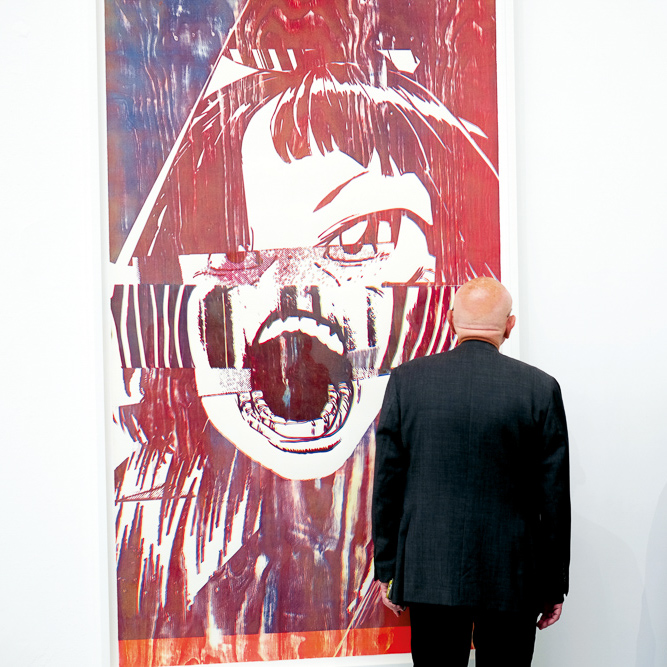 Dämonisch verzerrt schreien uns die Holzschnitte von Christian Marclay entgegen. Wiederum das Gesicht, aber jetzt fragmentiert und fratzenhaft. Bezugnehmend auf Edward Munchs ‹Der Schrei› von 1883, hat der amerikanische Künstler Kollagen aus amerikanischen Comics und japanischen Mangas erstellt und anschließend in Holz geschnitzt und gedruckt. Marclay geht in seinen Arbeiten immer von gefundenen Objekten aus, die er bearbeitet und neu zusammensetzt. Seiner Auffassung nach wäre es vergeblich, zu versuchen, ganz originell zu sein.(4) Seine appropriierten und manipulierten Fratzen haben eine merkwürdige Ausstrahlung. Sie erscheinen zugleich bekannt und fremd, echt und gemacht – eine Art Zwitterbilder. Man müsste vor ihnen eigentlich zurückschrecken. Das passiert aber nicht. Die Mehrheit geht still vorbei, viele versunken in ihre Handys. Vielleicht liegt es daran, dass die Bilder so ästhetisch wirken; vielleicht daran, dass wir heute so gewohnt sind, diese Art Bilder zu sehen, dass sie uns nicht mehr berühren. Marclays zweites Werk in der Ausstellung ist eine gewaltige Filmprojektion, in der 1948-Kriegsfilme immer kleiner übereinandergelegt, Film auf Film, gleichzeitig ablaufen. Eine Kakofonie aus Bildfragmenten und Tonschnipseln. Lange bleibt man nicht stehen; die Filme sind ja nur an den Rändern erkennbar und das Ganze erscheint recht ausgedacht. Und doch, die Kombination aus strenger Geometrie und dem fragmentierten Chaos lässt einen nicht so schnell los.
