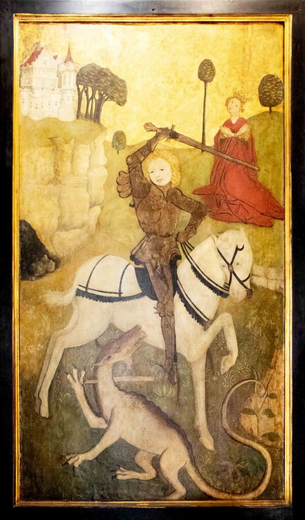 Interessantes Bild. Es handelt sich allerdings um Georg, nicht um Michael. Michael hat Flügel und bekämpft nicht den Drachen, sondern den Teufel. Es ist Georg, der das Ungeheuer besiegt und damit die Prinzessin rettet, von der auf Ihrem Ausschnitt ein Teil zu sehen ist. Auf Michael-Bildern gibt es keine Prinzessin. Wenn Sie das Bild komplett fotografiert haben, wäre es nett, wenn Sie mir die Bilddatei per mail zuschickten. Ich schreibe einen Roman, in dem jemand vorkommt, der Bilder von Sankt Georg sammelt und vergleicht, ich als Autor interessiere mich daher für die verschiedenen Georg-Darstellungen. Gruß, Joseph von Westphalen