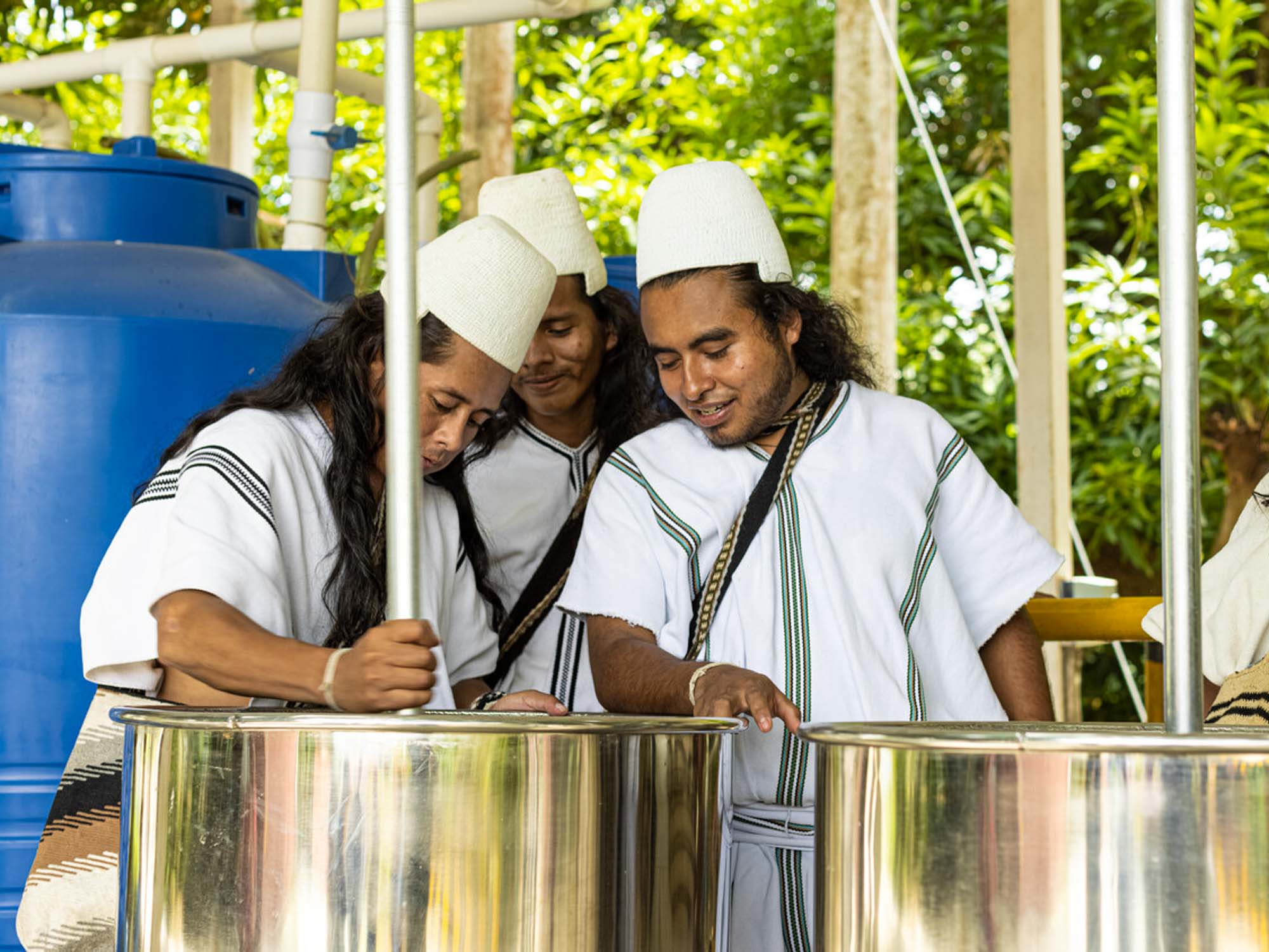 Die Arhuacos haben eine jahrtausendealte Tradition in ihrer nachhaltigen Landwirtschaft. Gemeinsam mit ihnen erforscht das Team vom Betrieb Dominique Bananas, wie die biodynamische Praxis, die für europäisches Klima und Territorium geschaffen wurde, im tropischen Klima zur Anwendung kommt.