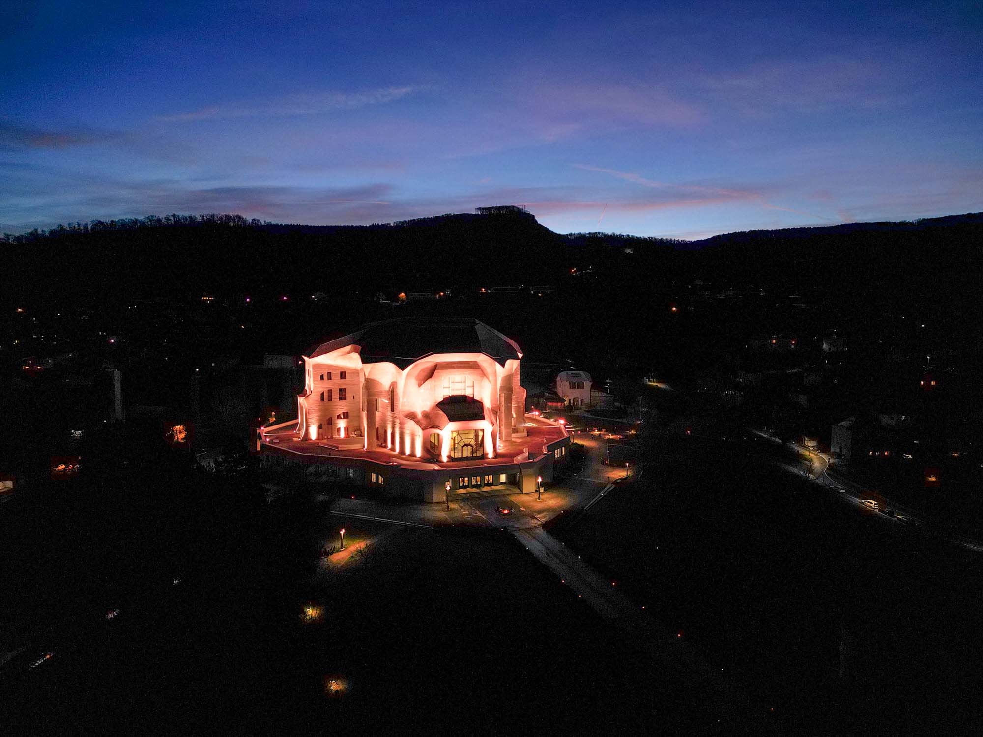 Ein Juwel in Wärme gefasst und von Leben durchdrungen – so erschien das Goetheanum mit Feuerschalen und 2000 Besuchenden zur 100. Silvesternacht nach dem Brand des Ersten Goetheanum.