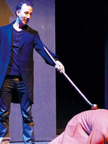 Mal stützt er sich auf ihn als Spazierstock, als würde er die Erde aufspießen, dann zeigt er damit auf Gretchen. Mal halten Faust und er je ein Ende und binden sich so aneinander, dann ist er das Schwert, das er Faust auf die Brust setzt.