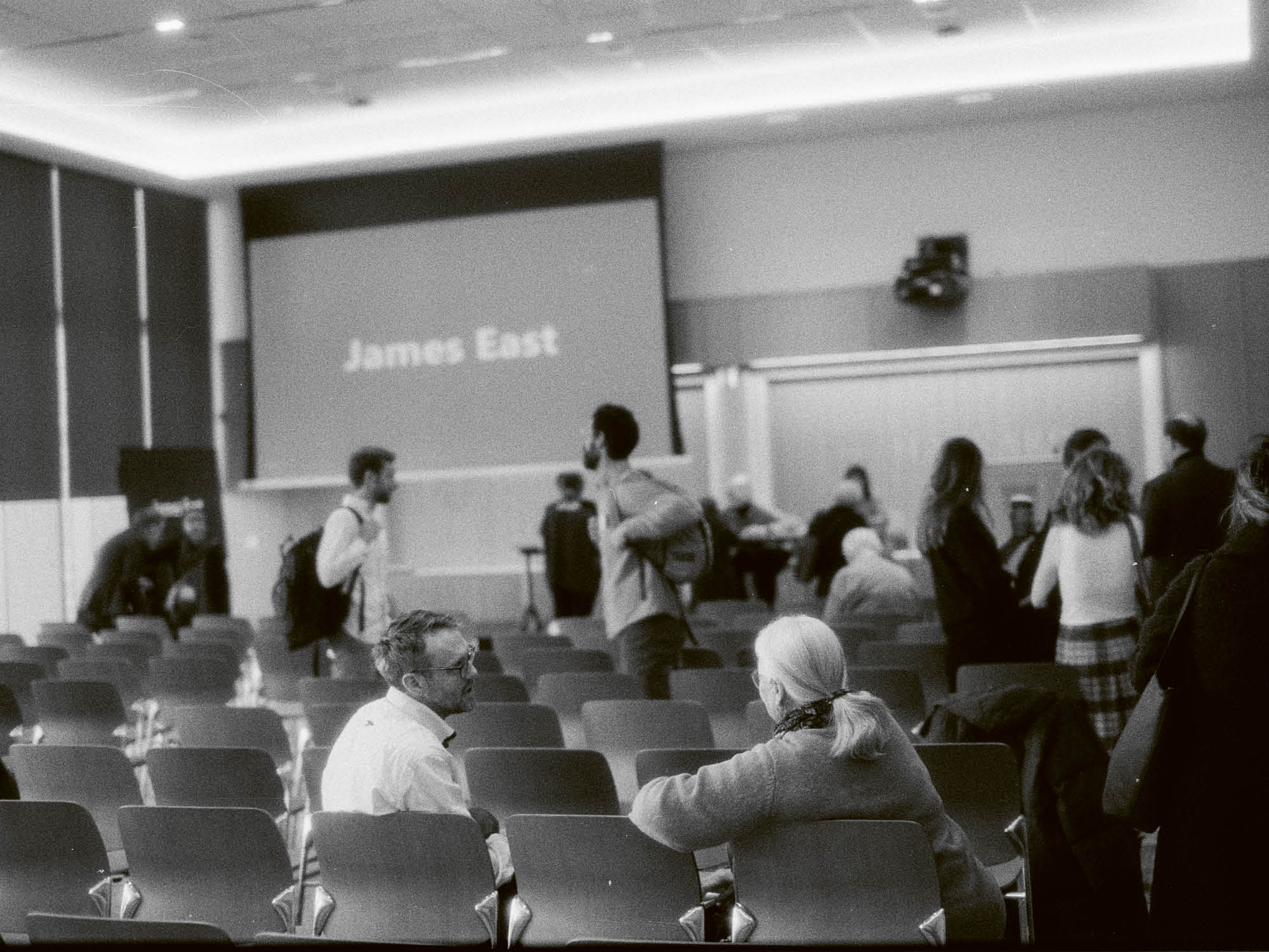 Titelbild James Room East nach einer Podiumsdiskussion – Konferenzorganisator Henry Holland im Gespräch mit einer Teilnehmerin. Foto: Garret Harkawik