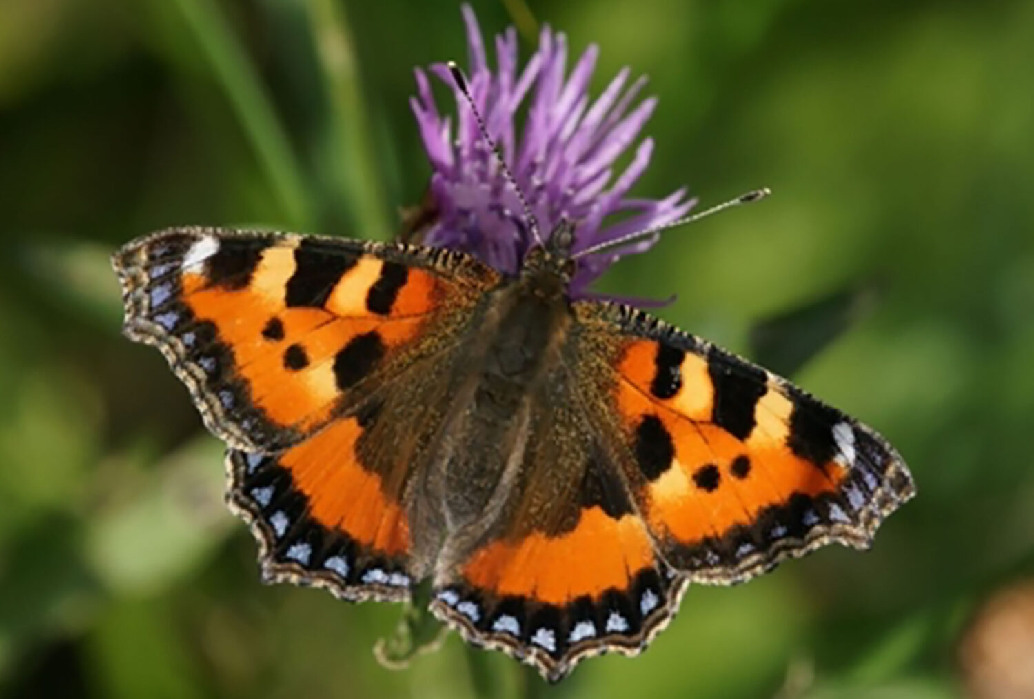 Schauen wir uns nun die mikroskopische Struktur des Schmetterlingsflügels, zum Beispiel des kleinen Fuchses (Aglais urticae), an (Abb. 4), um zu sehen, wie er sowohl mit dem Licht als auch mit der Luft spielt.7 (Abb. 5) Denn die Farben der Schmetterlinge beruhen auf zwei grundlegend verschiedenen Prozessen, die weitgehend von der jeweiligen Farbe abhängen. Die meisten Schmetterlinge erhalten ihre verschiedenen Braun- und Gelbtöne aus Melanin, dem gleichen Pigment, das uns im Sommer braun werden lässt und manchen Menschen Sommersprossen verleiht. Auch Orange, Gelb und Schwarz sind im Allgemeinen auf Farbstoffe zurückzuführen. Wenn man jedoch die im Allgemeinen irisierenden (leuchtenden, sich intensiv verschiebenden) Blau-, Violett- oder Weißtöne sieht, so sind diese nicht in irgendeinem Pigment auf dem Körper zu finden, sondern werden durch die Mikrostrukturen der Chitinschuppen verursacht: eine sogenannte Strukturfarbe, die durch die Art und Weise bestimmt wird, wie das Licht mit diesen winzigen mehrschichtigen Strukturen interferiert.