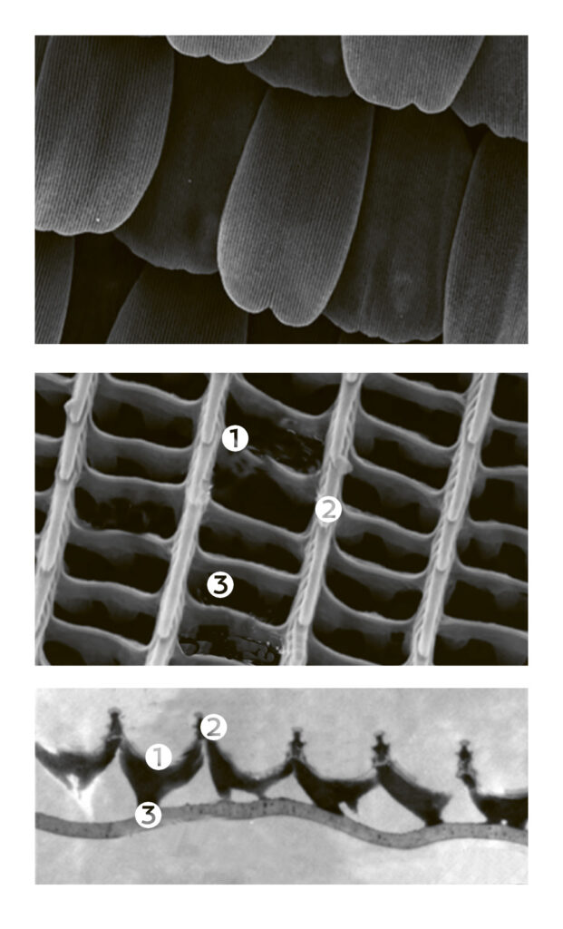 Abb. 4: Schuppen von des Kleines Fuchses (Aglais urticae), abgebildet durch Rasterelektronenmikroskopie. (b) Die Vergrößerung einer einzelnen Schuppe (a) zeigt die Grate und Rippen der oberen Lamellen sowie die Trabekel, die die oberen und unteren Lamellen verbinden. (c) Eine Seitenansicht der gleichen Struktur, aufgenommen mit dem Transmissionselektronenmikroskop.