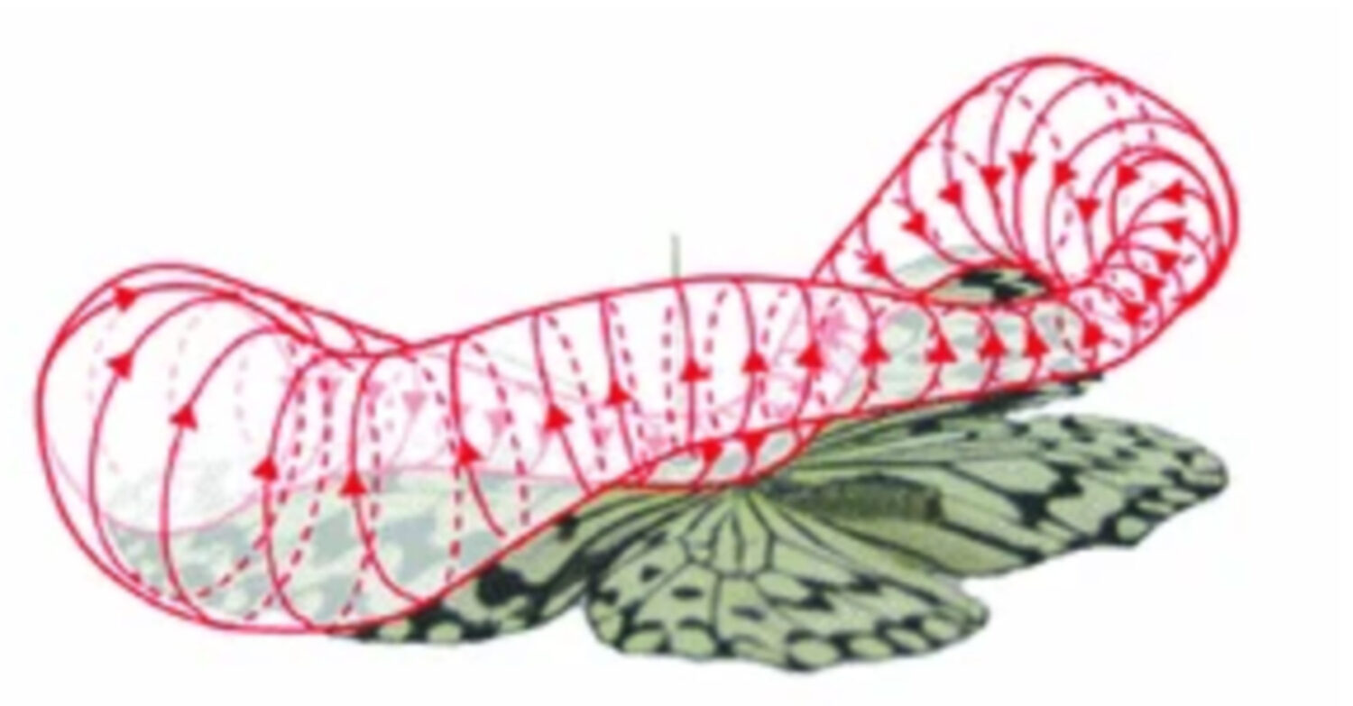 Schmetterlinge weben ihre wirbelnden Bewegungsteppiche aus der sie umgebenden Luft.3 Beim Abwärtsschlag öffnen sich die Flügel und bewegen sich nach unten, wodurch ein Ringwirbel entsteht (Abbildung 1). Er ist zunächst klein und seine Achse ist dicht an der Flügeloberfläche, dann entfernt sie sich aber allmählich, während der Wirbel wächst. Der Druck auf der Unterseite und die dem Wirbel innewohnende Saugkraft erzeugen den Auftrieb.