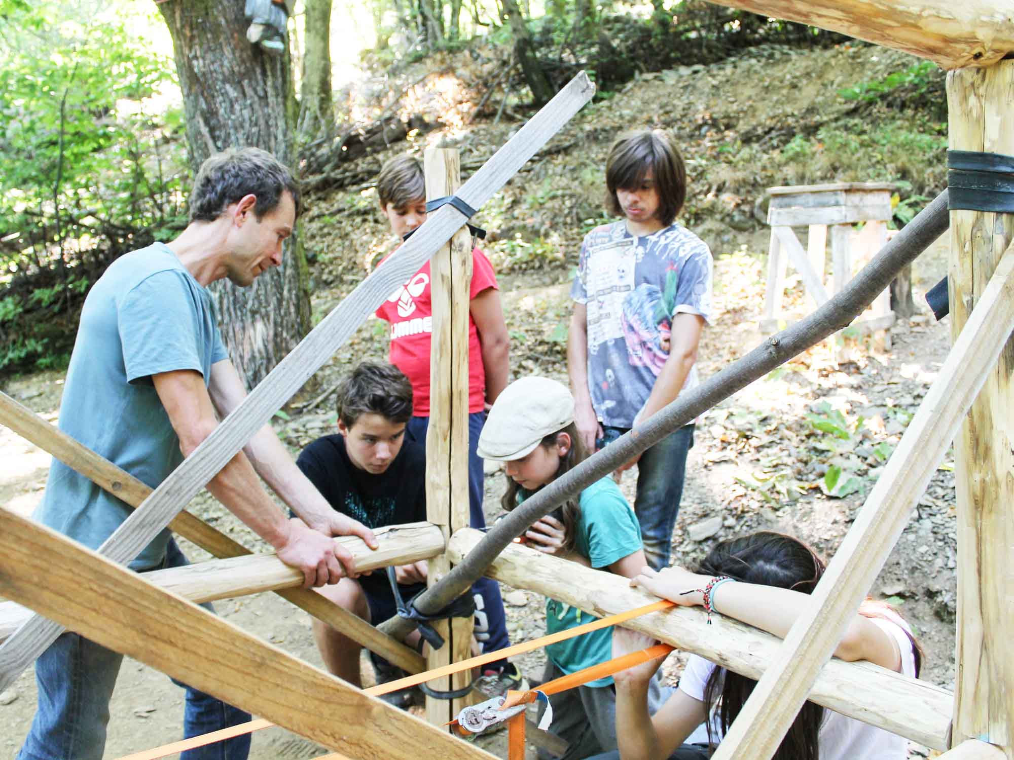 In dichten Wäldern und grünen Bergen in der Region Cevennes in Südfrankreich laden die beiden ein, Natur- und Holzverbundenheit zu teilen. Die Kinder lernen, Hütten und andere einfache Strukturen aus Holz zu bauen, eine Woche lang Feuerholz oder Holzobjekte ihrer Wahl herzustellen. Die Arbeit findet jeden Vormittag in kleinen Gruppen von maximal acht Kindern und in einer wohlwollenden Atmosphäre der gegenseitigen Hilfe statt: «Einander zuhören, Spannungen spüren, Worte finden, um Schwierigkeiten und Qualitäten aufzuzeigen, an denen wir arbeiten müssen, um uns gemeinsam gestärkt zu verabschieden», ist das Ziel. Nachmittags kehren die Kinder zu ihren Familien zurück, die in nahegelegenen Hütten unterkommen können. Delphine und Pierre sprechen neben Französisch auch Englisch, Deutsch und Italienisch. Dieses Jahr werden sie im Oktober und November weitere Workshops in der Nähe von Paris anbieten.