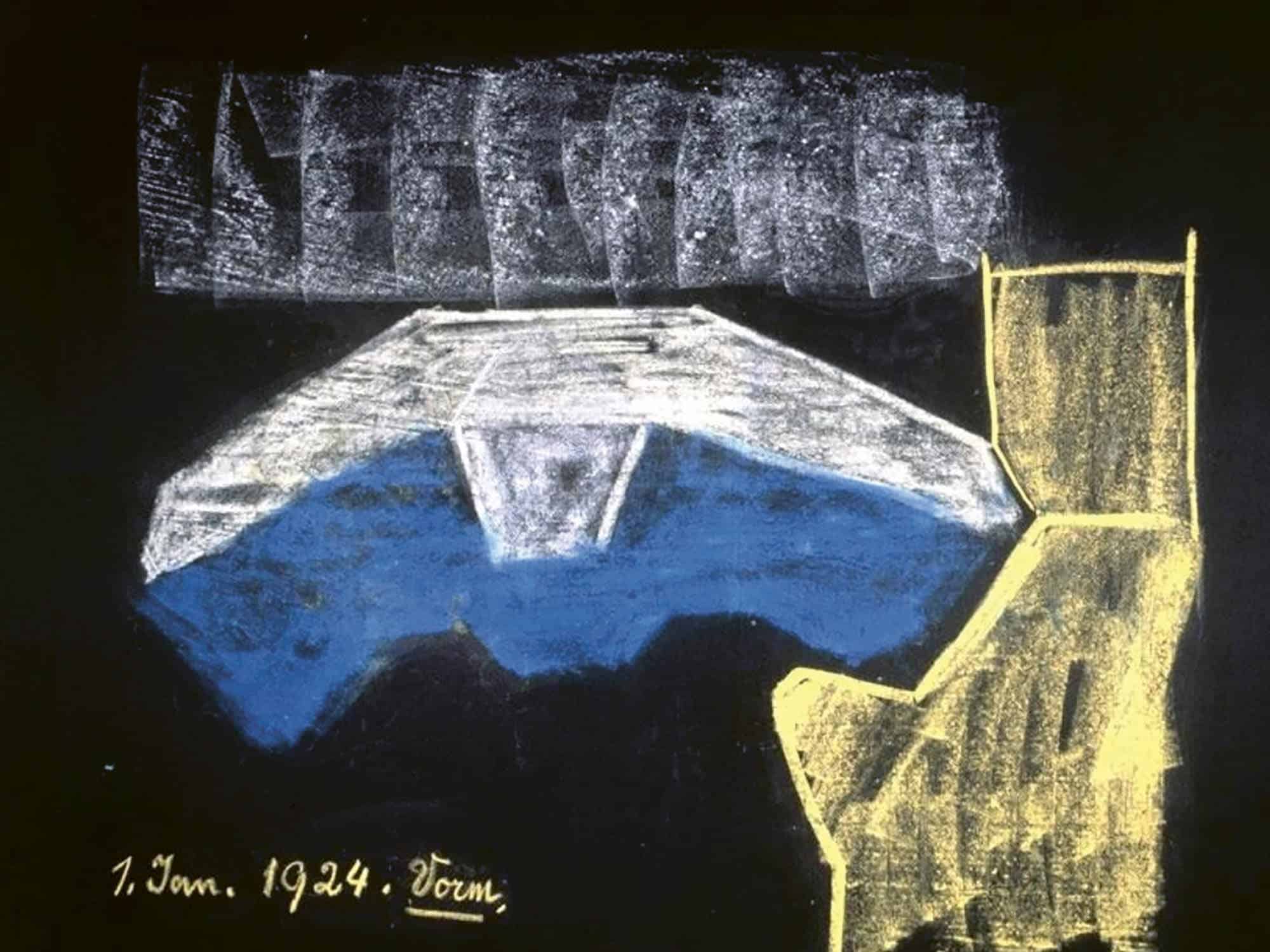 Bild Rudolf Steiner, Tafelzeichnung mit dem archetypischen Motiv des Zweiten Goetheanum, 1. Januar 1924