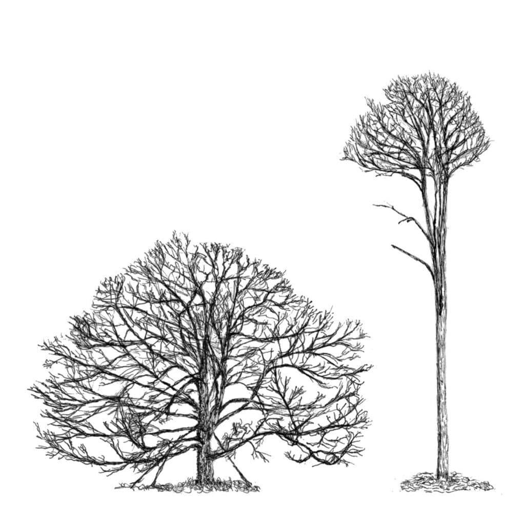 Wir können Eichenblätter betrachten, die von zwei diesjährigen Zweigen desselben Baumes stammen. Ein Zweig befand sich der Sonne zugewandt, der andere im Schatten der Krone. Wir bemerken: Die Vielfalt der Formen hängt auch mit dem eigenartigen Phänomen ‹Umgebung› zusammen! Wir sehen, dass der Baum aus seinem eigenen schöpferischen Spiel heraus unterschiedliche Blätter hervorbringt, bezüglich der Welt, in der er und durch die er lebt. Was wir Umwelt nennen, spiegelt sich in dem ‹Anderswerden› des Baumes. Die Zeichnungen zeigen eine Weiß-Eiche, die im Winter am Rande einer Wiese wuchs. Die andere steht im Wald etwa 100 Meter entfernt, im Tal neben einem Bach. Was wir als die ‹typische›, frei stehende Eichenform ansehen, ist somit nur eine Ausdrucksform der Eiche. Die Umwelt befindet sich nicht ‹außerhalb› des Baumes. Jeder Baum, wie jegliche Pflanze, bringt zum Ausdruck, was ich die elementare Lebenswelt nenne – Luft, Wasser, Licht, Wärme, Boden mit Mineralien und anderen Organismen. Ohne diese Lebenswelt würde der Baum nicht sein. Er würde seine Identität nicht realisieren und seine Diversität nicht entfalten.