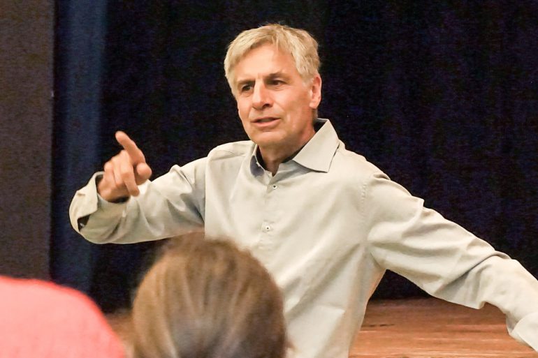 Es ist sein typischer Dreischritt für Gerald Häfner. Zuerst hält er einen Vortrag in hohem Tempo und mit Energie. Dass kein Mensch böse ist oder Böses will, sondern es fast immer die Verhältnisse sind, die uns vom Guten abweichen lassen, ist einer seiner Gedanken.