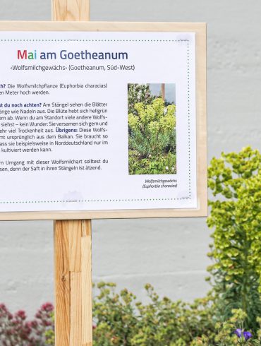 Unter dem Stichwort ‹Mai im Goetheanum› informiert die Gärtnerei seit einigen Wochen auf Schildern Spaziergängerinnen und -gänger über die Artenvielfalt im Gartenpark des Goetheanum.
