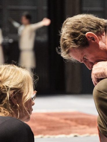 Andrea Pfaehler (Regie) spricht mit Dirk Heinrich (Faust) über die Szene, in der Faust dem Wunsch des Kaisers folgt und Helena und Paris in einer Art Astralkino herbeizaubert.