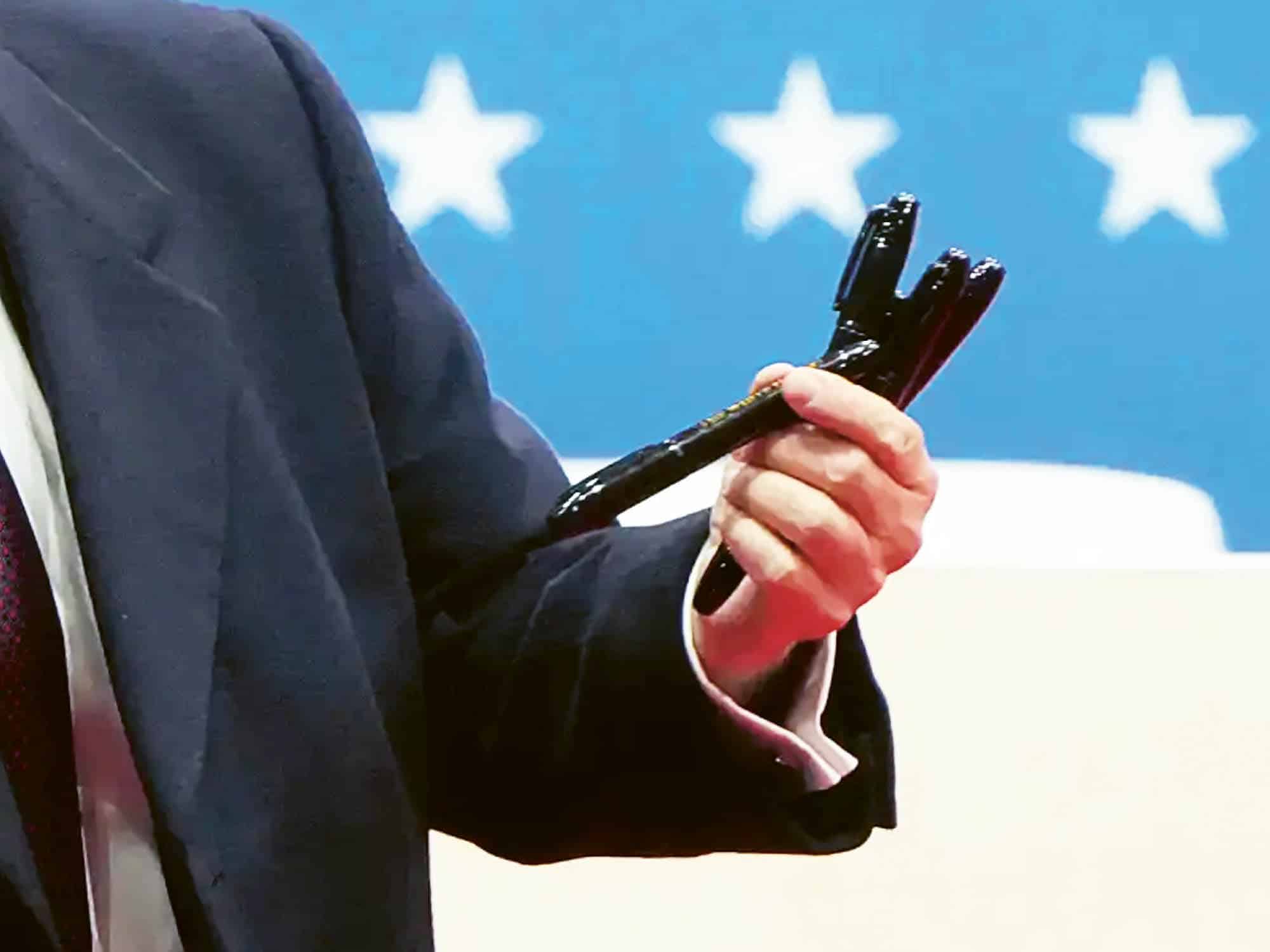 Ein Bild für die Geschichtsbücher: Der neue US-Präsident unterzeichnet in der Baseball-Arena stapelweise die präsidialen Dekrete, als würde er Bücher signieren,...