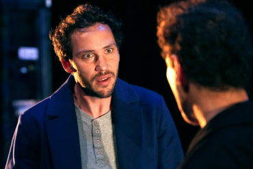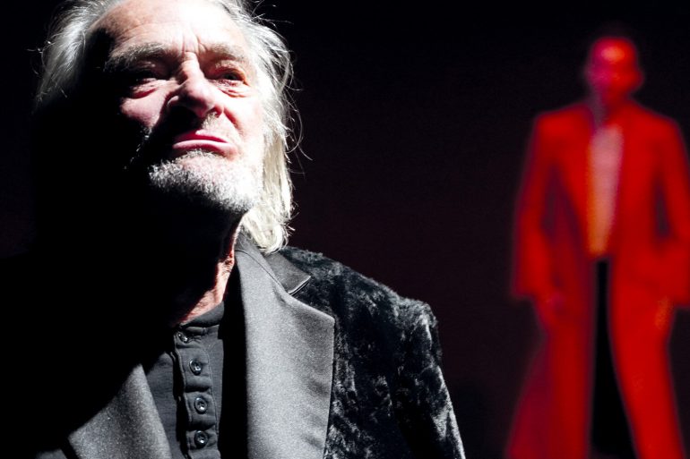 Da steht Urs Bihler, einer der drei Mephisti, an der Kante zum Publikum. Er spricht nach vorne und schickt seine Energie doch nach hinten, dorthin, wo Faust einsam verzweifelt.