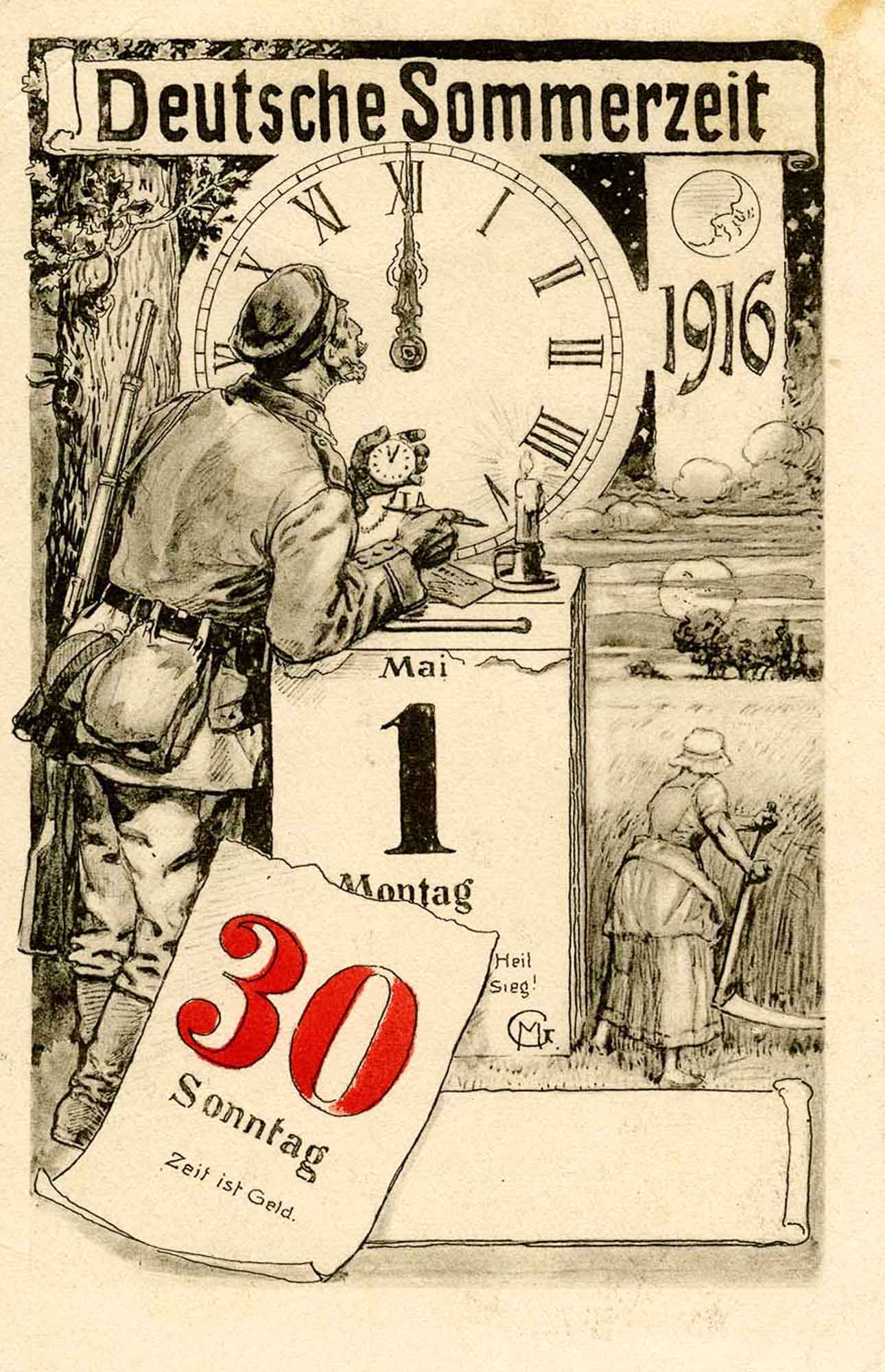 Bild: Postkarte zur Einführung der Sommerzeit in Deutschland am 30. April 1916 (Deutsches Uhrenmuseum)