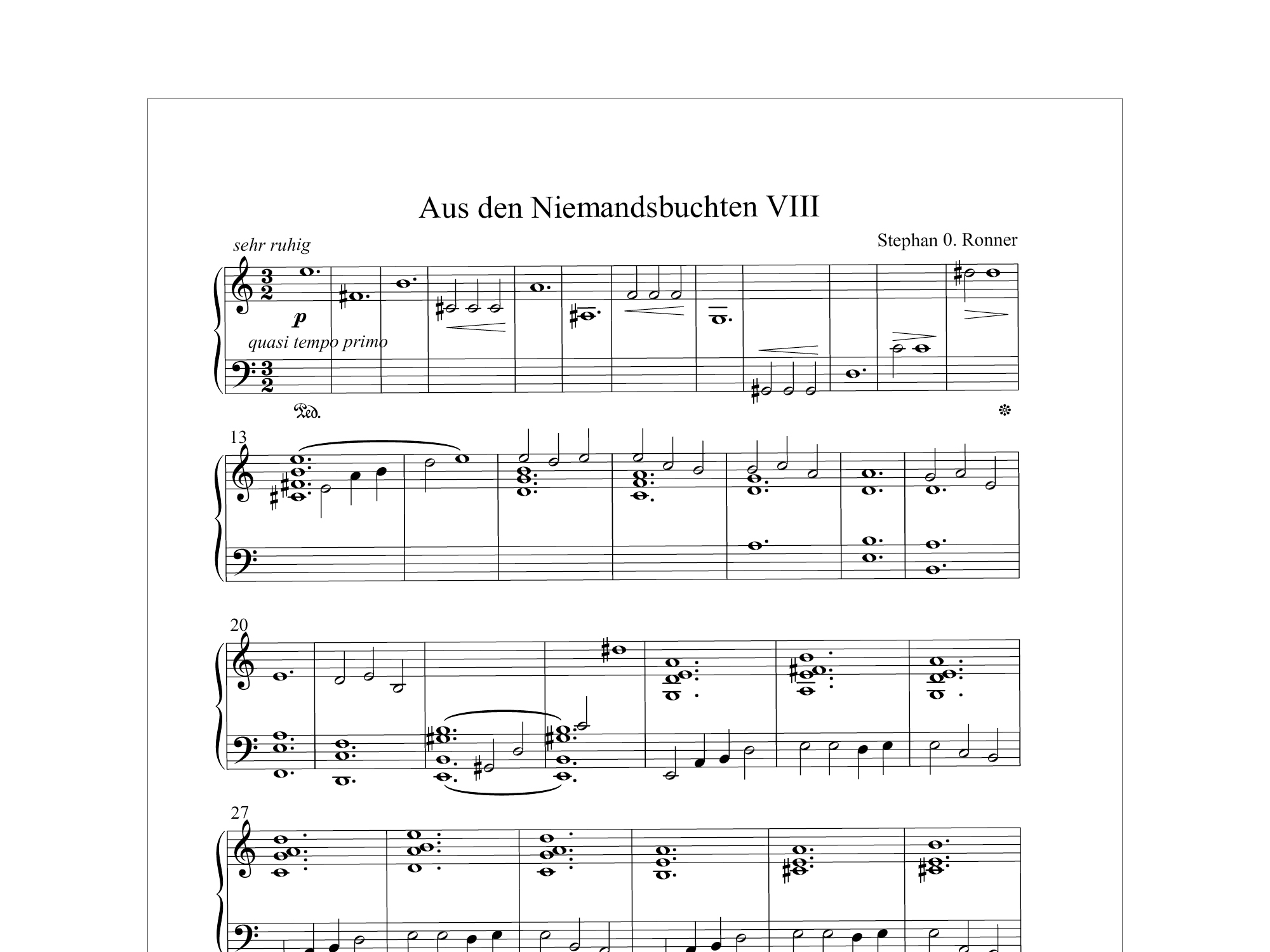 Die Vorgaben sind knapp und schlicht, ein Notenschreibheft hat 48 Seiten und 12 Systeme. Diesem Format folgend, fügen sich jeweils 24 Klavierskizzen zu einem zyklischen Ganzen zusammen. Inzwischen liegen fünf solche Zyklen vor, weitere befinden sich in Arbeit. Jede Skizze hat einen eigenen Charakter, jedes Stück trägt sein eigenes Gesicht, seine eigene Handschrift, erzählt seine eigene Geschichte. Zwei dieser Zyklen mit Klavierskizzen ‹Aus den Niemandsbuchten› liegen nun gedruckt vor. Der Titel dieser Sammlung leitet sich von Peter Handkes Buch ‹Mein Jahr in der Niemandsbucht› ab und gibt auch ein wenig den Stil vor. Wandeln, Schlendern mit offenen Sinnen durch die Ränder der Stadt, durch die Vororte, Hinterhöfe, Gärten, Brachen, Waldstücke, inmitten dort, wo wir leben, aber eben bisher noch nicht wirklich erleben, wo wir eigentlich sind und was sich da eigentlich Wunderbares verbirgt. Die Musik erzählt Episoden von uns, von hier und jetzt. Ohne große Ambitionen, ohne Hürden des Unnahbaren, in einem ‹stile povero›, schlicht, direkt, authentisch, öffnen sich Brücken und Stege zwischen den Stilen und Prägungen, zwischen den eingeübten und den weniger vertrauten Sprechweisen, frei nach dem Motto «Künftiges ruhe auf Vergangenem» vermittelnd und verbindend. Durch Eins-zu-eins-Vorspiele und Verwendung im Unterricht als Hörgeschichten haben sich manche dieser Musiken bereits mehrerenorts verdient gemacht.