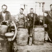 Links: Vesnas Familie bei der Arbeit am Hof. Von links nach rechts ihre Tochter Iris, ihr Vater Danijel, ihr Mann Edvard und ihre Mutter Angela. Foto: Vesna Forštnerič Lesjak. Rechts: Vesna während der Schwangerschaft beim Rühren des Baldrian-Präparats für den Komposthaufen, zusammen mit den Mitgliedern ihres Vereins Sapientia. Ein Monat später wurde ihre Tochter Iris am Ostersonntag geboren. Foto: Edvard Lesjak