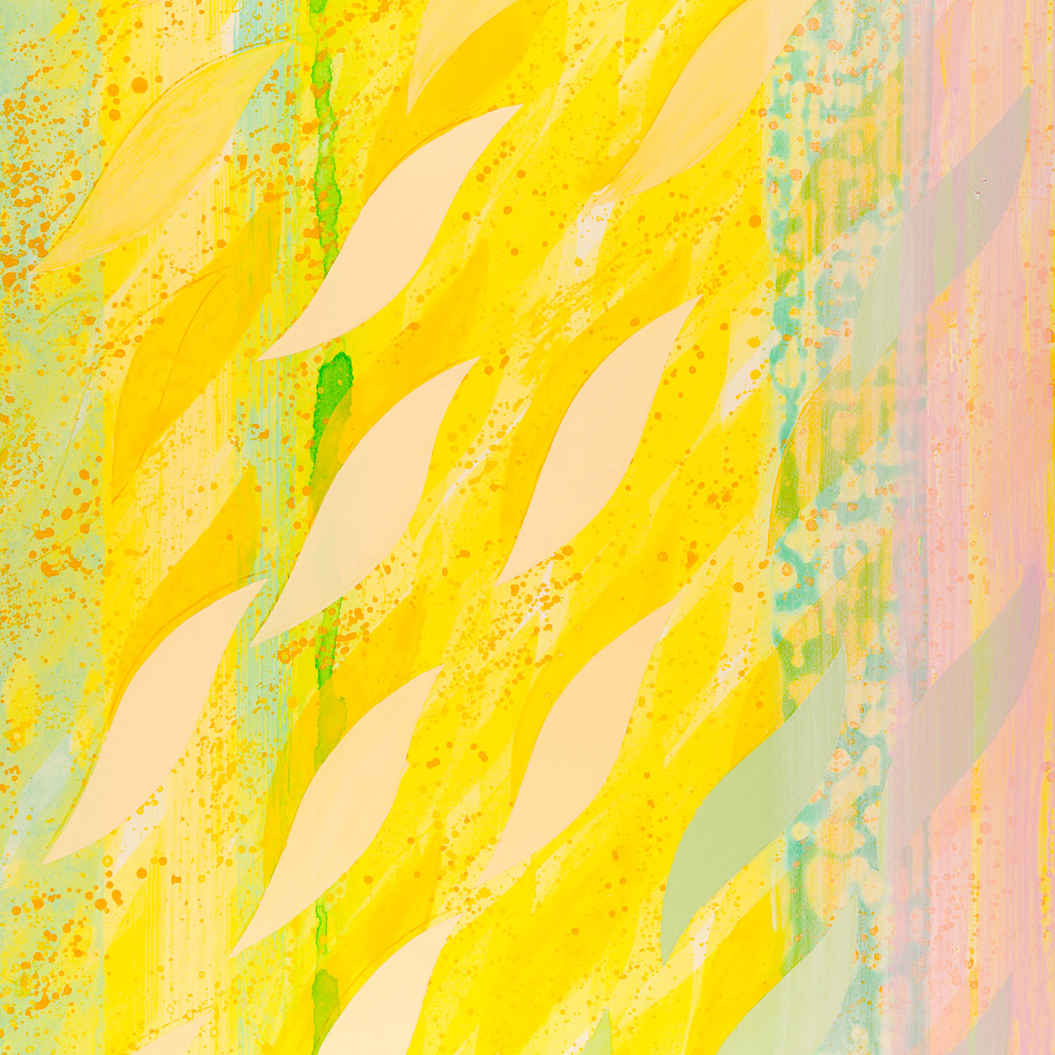 «Für viele Menschen wirken meine Arbeiten abstrakt.8 Aber sie sind ein ganz konkreter Raum. Sie sehen nur scheinbar abstrakt aus.» Der dritte Band der Notizbücher, ‹Lichtblatt›, enthält keine Sprachkunst mehr. Er ist farbig, etwa A-4-formatig und im Hauptfarbton Cadmium-Gelb. Kleine Beschriftungen unter den Bildern, die wissenschaftlich klingen: ‹Spektralbewusstsein, Osiris-Zersplitterung, Bewusstseins-Briks9›. Die Drehpunkte der Bewusstseinsentwicklung, kosmische Felder, evolutionäre Systeme sind bei Stéphane immer auf großes Interesse gestoßen. «Jede Bewusstseinsstufe hat ganz bestimmte Werte, die auch verteidigt werden. Sie unterscheiden sich in Farben voneinander. Und für jede Bewusstseinsschicht ist eine bestimmte Art von Theoriebildung wesentlich und richtig. Die Weltenkraft ist geschichtet, so auch unsere Bewusstseinsentwicklung.» Etwas schwingt in den Bildern, am deutlichsten zu erleben natürlich in den großformatigen Originalen. Auch hier wieder Klang. Das ‹Lichtblatt› ist immer der Untergrund dessen, was in den Bildern des dritten Notizbuches geschieht. Dem voraus gingen persönliche Erlebnisse in dieser Sphäre, dann die Frage der Umsetzung und die Frage danach, wie man den Betrachtenden mit einbeziehen kann, sodass er es nicht etwa ‹nur voll serviert› bekommt.10 Die ‹Lichtblatt›-Arbeiten bestehen aus einem gelbgeschichteten pulsierend-geistigen Feld, das in ständiger Verwandlung ist. Sie versuchen, durch eine gestaffelte Schichtung mit doppelt gebogenen Flächen in bestimmter Wiederholung die verwandelten Lebenskräfte als ‹Substanzabstraktion› künstlerisch ins Erlebnis zu bringen. Das ‹Lichtblatt› ist eine Urkraft, möglicherweise ein Urbild, ein Archetypus, eine Bewusstseinssubstanz, poetisch von Stéphane als ‹Lichtblatt› benannt. Es ist das Ende seiner Arbeit und doch beginnt dort immer auch wieder sein Anfang. «Die Schwierigkeit für den Maler ist, dass er ‹umsetzen› möchte, ohne einem übersinnlichen Naturalismus zu verfallen. Das setzt ein gewisses Abstraktionsvermögen voraus, vom ‹betrachtend-Schaffenden› und dem ‹schaffend-Betrachtenden›.» Unbefangene Menschen sagen zu den reinen ‹Lichtblatt›-Arbeiten gar nicht Bild, sondern umschreiben es als Energie. Ein eher abgekühltes Gelb hat der Maler gewählt, um dem Betrachter Zeit zu lassen, z. B. die feinen, vorerst nicht sichtbaren Komplementärfarben zu erleben und im ‹Nachmitschaffen› sich selbst an die Substanz anzunähern. Das Gelb ist nur ein Hilfsmittel. Die Bewegungsstruktur ist das Wesentliche. Somit ist das ‹Lichtblatt› kein ‹fertiges› Bild. «Man könnte auch parallel dazu meinen, dass es eigentlich fast wie ein Nichts ist, die Farbflächen, wo Farbe relativ formlos11, aber leuchtend aufgetragen ist.»