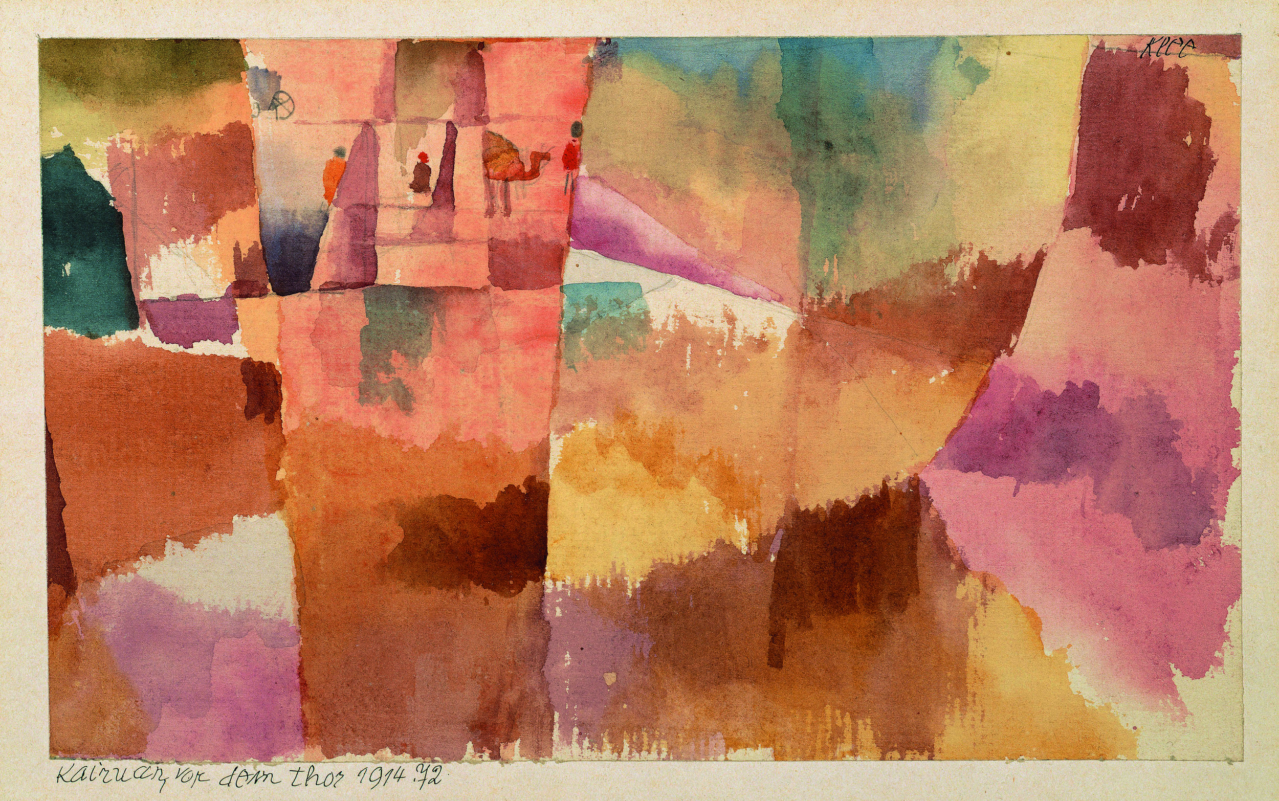 Fast nichts ist zu sehen, ein paar Flächen in Braungelb, Violett, hier und da Blau; Teilungen, nur von Tönen und Leere besetzte Farbflächen. Nur in einer viereckigen Region, wie in einem Fenster, in sich wieder verteilt, sind ein halbes Kamel, ein herausfahrender Wagen und die Andeutung dreier Figuren zu sehen. Die Malerei steht vor dem Tor, noch nicht angekommen, ihre Elemente sammelnd und sie von der Welt unterscheidend: Es sind Bausteine, nicht Überreste. Vielleicht, wenn wir durch das Tor kommen würden, vielleicht bildete sich dann etwas, eine Sichtbarkeit, ein ganzes Kamel, eine Stadt. Malen, bei Klee, bedeutet, der Schöpfung immer Momente voraus zu sein; nur dann, vielleicht, wie bei einem erwarteten Sonnenaufgang, gäbe es etwas zu sehen. Nichts ist abstrahiert, nichts vereinfacht, nichts reduziert, alles wird versammelt: die Farben, die elementaren Bausteine der Fläche, der Form, des Raumes, alles, was dem Sehen vorangeht, was das Werden einer Sache ermöglicht, wird versammelt, um vielleicht später, durch das Tor geführt, Neues sichtbar zu machen. Die Wüste, also die Leere, ist nicht das, was bleibt, es geht den Dingen voran, ist Potenz, ein reiner Wille.