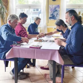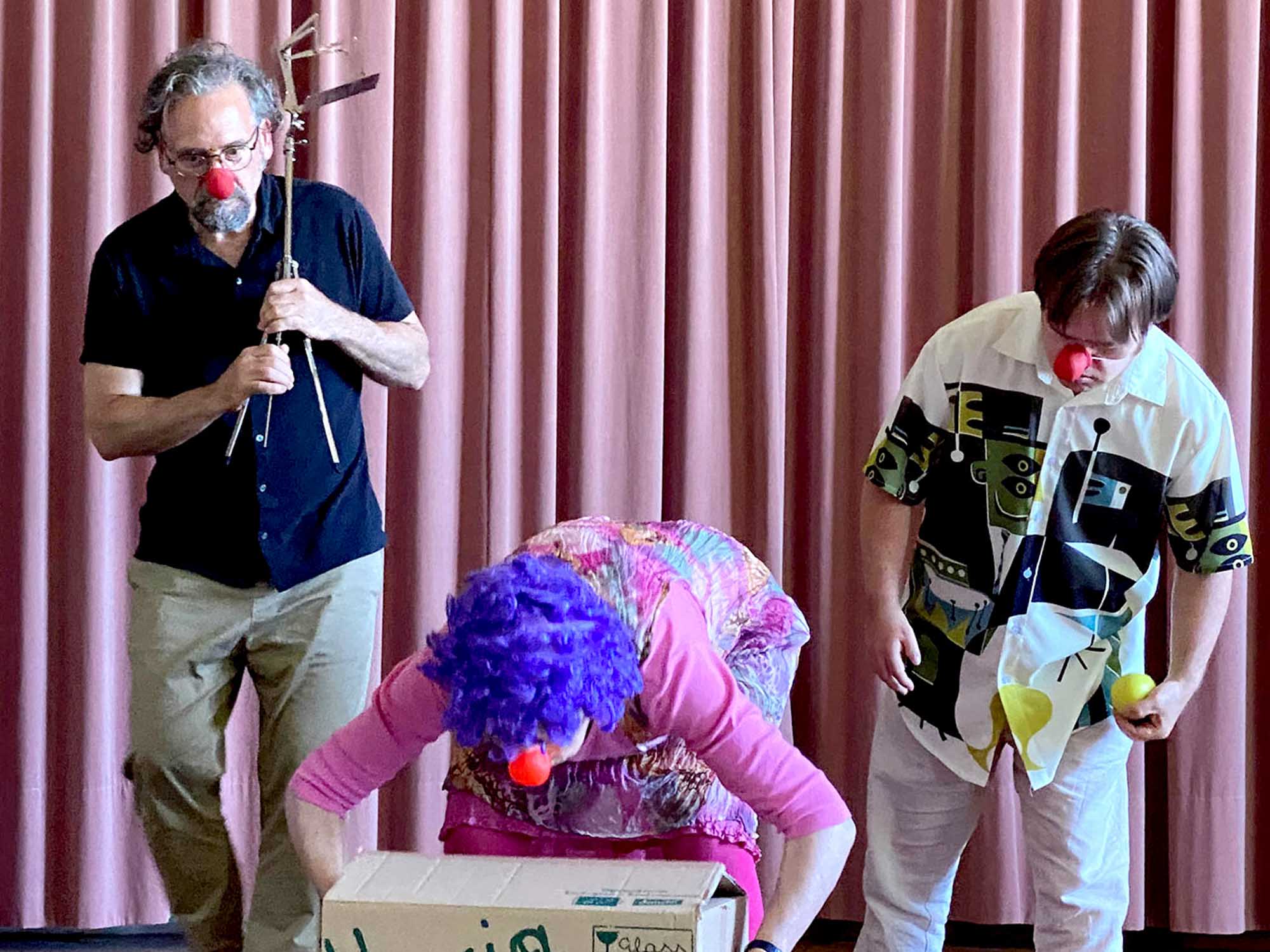 Fionn, der Geige spielt, das Down-Syndrom hat und eine Waldorfschule besucht hat, und Jonathan, der seit 1992 als Waldorflehrer in den USA und Irland tätig ist. Als ‹Fionnathan Productions› unterrichten wir Schulkinder im Umgang mit der Natur, Studierende in sozialen Reformen und Gemeinschaften in Inklusion. Jetzt hatten wir das Vergnügen, an einem Clownskurs am Goetheanum zu spielen. Dass die Teilnehmenden in drei Sprachen kommunizierten, war eine Herausforderung. Das Hören und Sehen ermöglichte uns, wahrzunehmen, ohne zu verstehen. Wir hörten Sprache – bedeutungsfrei. Unserem inneren Clown zu begegnen, war eine wunderbare Erfahrung. Die Interaktionen zwischen den Clowns ermöglichten es uns, in kleinen Szenen mitzuwirken und uns dabei selbst zu beobachten, wie wir in fantasievollen Austausch kamen. Fionn hat für eine Interviewreihe auf Youtube, die er ‹Happiness Project› nennt, 700 Menschen in 18 Ländern gefragt: ‹Was liebst du an deinem Leben?› Er hat Videos mit den Antworten in mehreren Sprachen (darunter Gebärdensprache) aufgezeichnet.