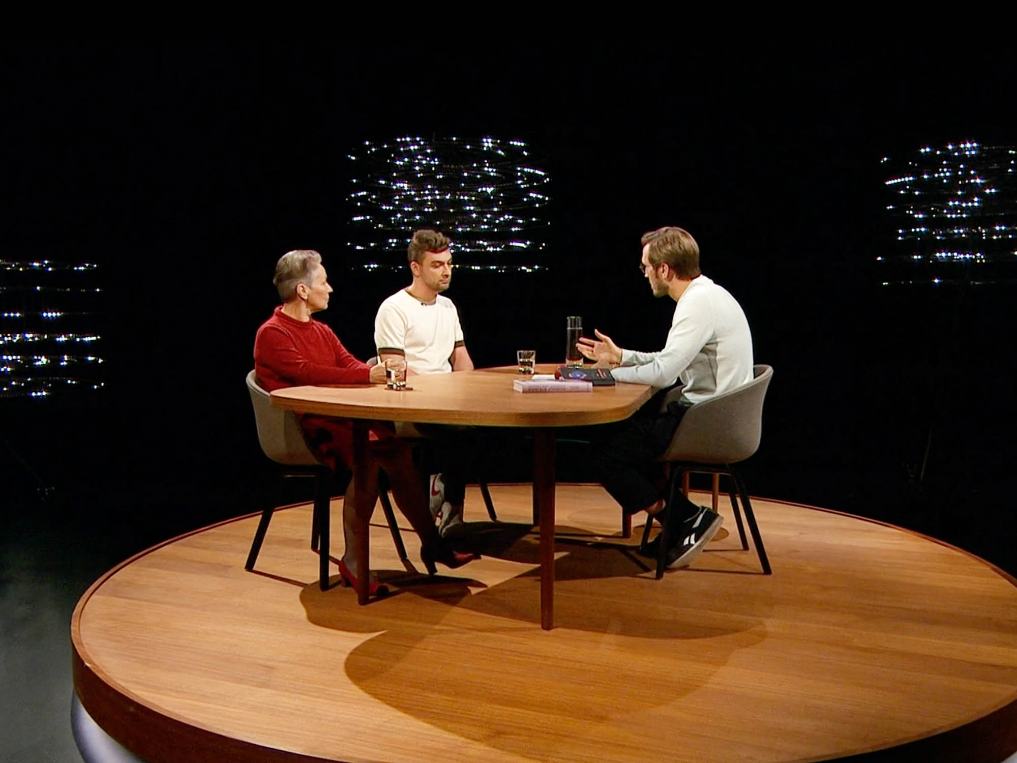 Bild Martina Maria Sam und Ansgar Martins mit Yves Bossart im Studio der Sendung ‹Philosophie Sternstunde› von 30.10.2022, SRF, Screenshot.