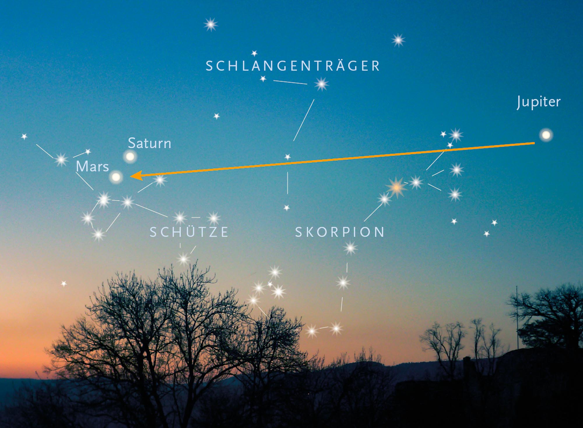 Die Spanne vom Fest der Jordantaufe bis Ostern dauerte drei Jahre und drei Monate. Im Kirchenjahr verdichtet sie sich in die drei- bis viermonatige Zeit von Epiphanias am 6. Januar bis zum Osterfest. Mit dem Aufstieg der Sonne wandert der Blick von der Geburt zum Tod und zur Auferstehung des Gottes. Dieses Jahr spiegelt Mars in seinem Lauf von Jupiter zu Saturn den Weg von der Taufe bis zur neuen Geburt. Am 6. und 7. Januar stand der rote Planet dicht bei Jupiter, dem Planeten des Erkennens und Ordnens. Nicht nur im Mythos repräsentiert Jupiter diese Eigenschaft. Er besitzt physisch mehr Masse als alle anderen Planeten zusammen und kann deshalb das Wo und Wie im Planetensystem prägen. Im Tierkreisbild der Waage, dem Bild des Gleichgewichtes, zeigte der Nachthimmel das klassische Bild des Willens, der durch Jupiter und damit durch die Kraft des Gedankens seine innere Ruhe und Balance bekommt. Mit dem Aufstieg der Sonne am Jahresanfang löste sich Mars von dem Erkenntnisplaneten und zog durch die dramatische Sternenregion des Skorpions. Kein Bild spiegelt die zerstörerische Kraft des Mars mehr als die geschwungene s-förmige Gestalt des Skorpions. Am Schwanz des Skorpions, wo der irdische Skorpion sein Gift hat, liegt auch das Zentrum der Milchstraße. Hinter Dunkelwolken, für die Teleskope deshalb kaum zu beobachten, liegt dort der Masseschlund, das schwarze Loch der Milchstraße.