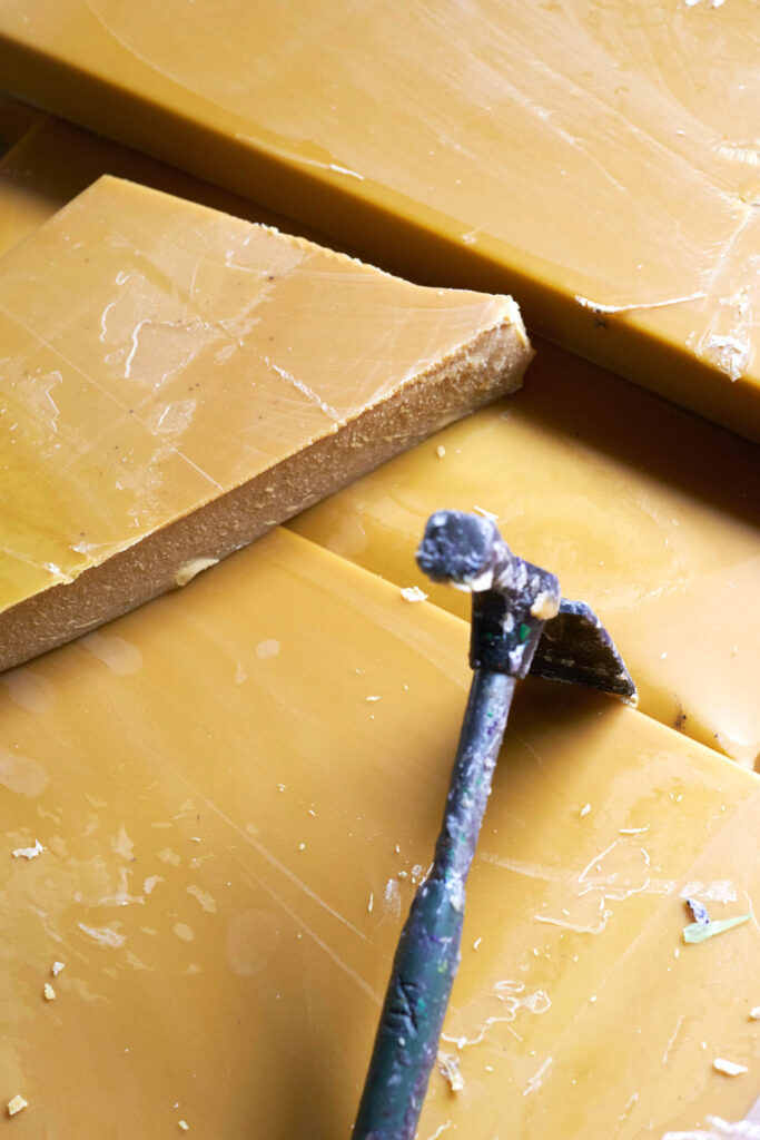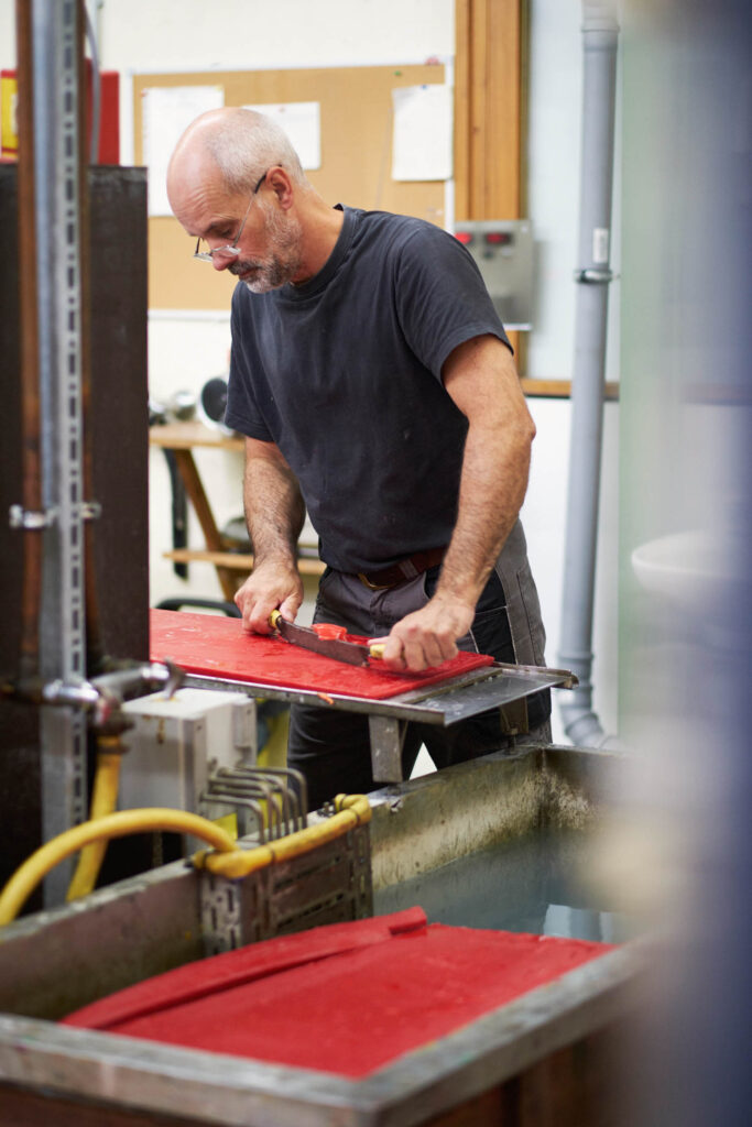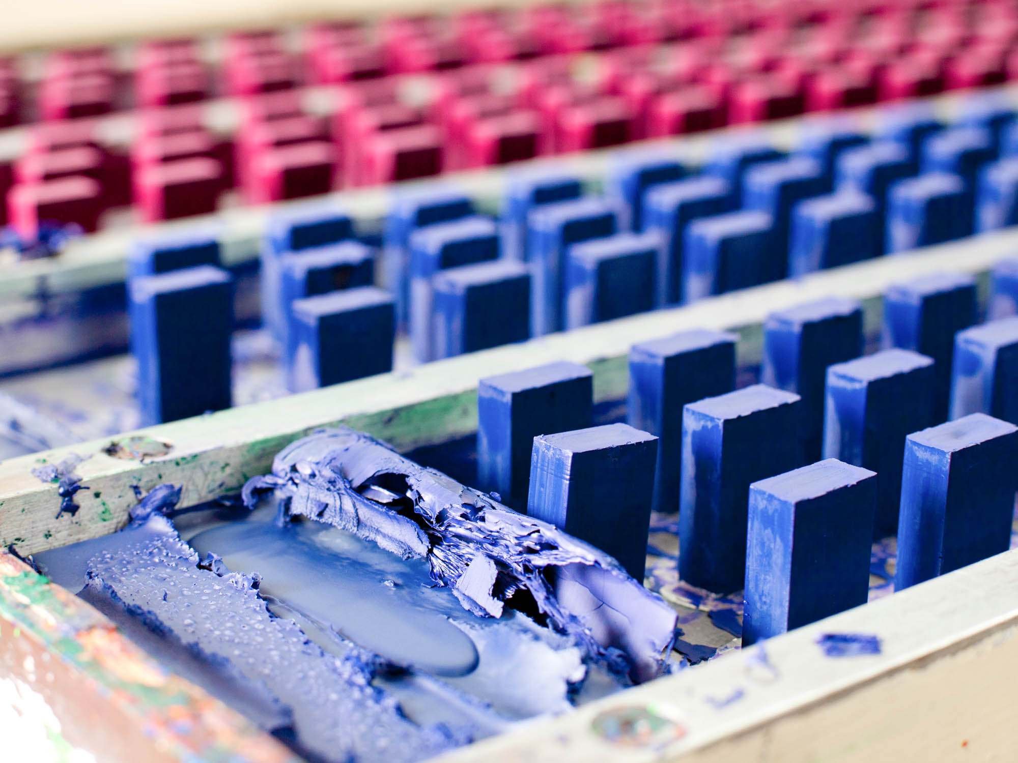 Womöglich spürt man diese vielen Hände, die wiederum selbst spüren können müssen. Heute werden die Farben Gelb, Grün, Weiß und Silber gegossen. Jan fühlt die Temperatur der Maschine, in die das flüssige Wachs eingefüllt wird. Er erzählt, dass jedes Farbpigment anders mit dem Wachs reagiert und eine andere Zeit zum Kühlen braucht. Auch reagiert jede der sieben Maschinen anders. Die eine möchte immer noch einen kleinen ‹Hochheizer-Schub›, bevor sie gut arbeiten kann. Die andere ruckelt immer etwas. In Metallformen gegossen, von kaltem Wasser umspült, warten die gelben Blöckchen noch darauf, aus ihren Formen genommen zu werden, während Jan die grünen schon anfassen kann. Er sieht, welche Makel haben, und sortiert aus. Die guten werden gestapelt und kommen in die Verpackungsabteilung. Im ganzen Kreislauf gibt es keine B-Ware, denn die ‹B-Blöckchen› werden wieder eingeschmolzen. Bei den goldenen wird besonders deutlich, womit wir es hier grundsätzlich zu tun haben: mit flüssigem Gold. Wie kleine Goldbarren sehen sie aus, entstammen aber der Veredelung eines Naturproduktes durch den Menschen. Entstanden zwischen Wärme- und Kälteprozessen, in einer Manufaktur, die diese Qualitäten auch versucht, im sozialen und gesamtgesellschaftlichen Miteinander wirksam werden zu lassen. Hier kann niemand arbeiten, der nur eine Maschine bedienen will. Hier braucht man seine Sinne. Draußen vor der Schmelzabteilung stehen die großen Tanks, in denen permanent das Wachs, die Grundlage, flüssig gehalten wird durch Wärmeschlaufen und einen verwirbelnden Oloid. Seit dieser arbeitet, stellen die Mitarbeitenden in der Schmelze fest, ist das Wachs besser, brennt nicht mehr so schnell an, ist irgendwie geschmeidiger. Die Firma ‹Oloid Solutions› ist übrigens eine Schwester von Stockmar Farben, denn auch sie ist eine der sieben Töchter der Neuguss-Gruppe.