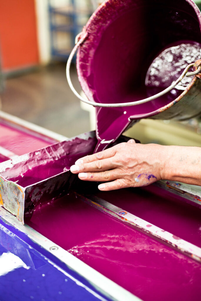 Neben der Schmelze liegt der Raum, in dem die Aquarellfarben hergestellt werden. Dort riecht es wie in einem Waldorfklassenzimmer, wenn Nass in Nass gemalt wird. Olaf, der seit 22 Jahren hier die Hoheit hat, sagt, das ist das Gummi arabicum, die Grundsubstanz für die flüssigen Farben. Olaf ist ursprünglich Konditor gewesen, auch ein Beruf, in dem es Wahrnehmungsfähigkeiten braucht oder eben Menschen mit Herz, Kopf und Hand. Ob er der Farben manchmal überdrüssig wird, so wie einem Arbeiter in der Schokoladenfabrik die Süße nicht mehr schmeckt? Er verneint. Und einige wenige Farbprobenpapiere hängen an Tür und Wand, weil sie besonders schön sind, wie Olaf fand. Die Leuchtkraft ist schon beeindruckend, dafür, dass es Aquarellfarben sind. Und irgendwie schade, dass es nur so wenige gibt. Ich hätte gern mehr gesehen von dieser absichtslosen Schönheit. Vor der Tür seiner ‹Farbenmischerei ›steht Olafs Fahrrad. Die Geschäftsführung hat allen Mitarbeitenden ein E-Bike-Leasing angeboten, was ca. ein Drittel der Menschen nutzt.